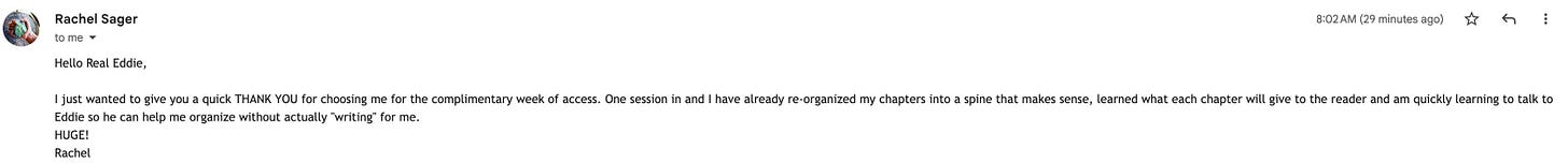 “One session in and I’ve already reorganized my book chapters into a spine that actually makes sense. I know what each chapter gives the reader now. I’m also quickly learning how to talk to Eddie so he can help me organize my thinking—without writing for me.