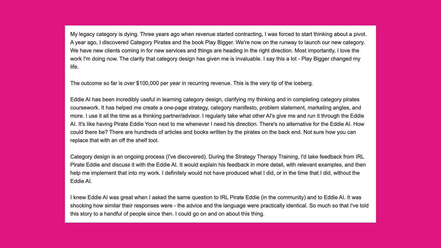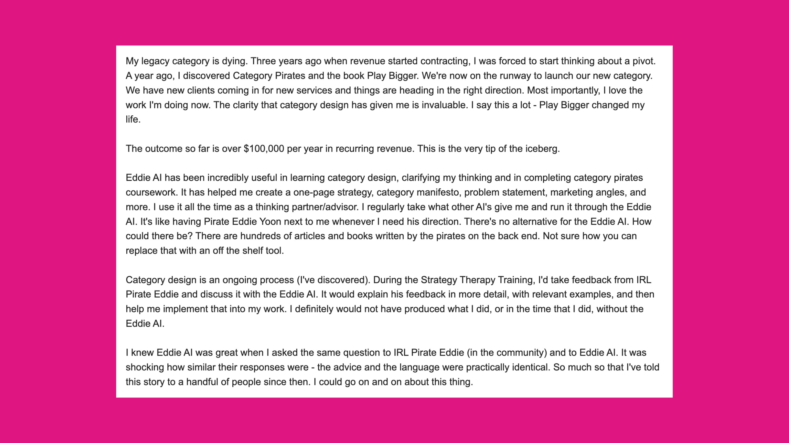 “Category Pirates is a deep library of insight. Eddie Bot is the tool that distills it. It helps you navigate the concepts, connect ideas, and quickly surface the articles most relevant to your quest. It’s the closest thing to having Eddie sitting beside you while you build.”