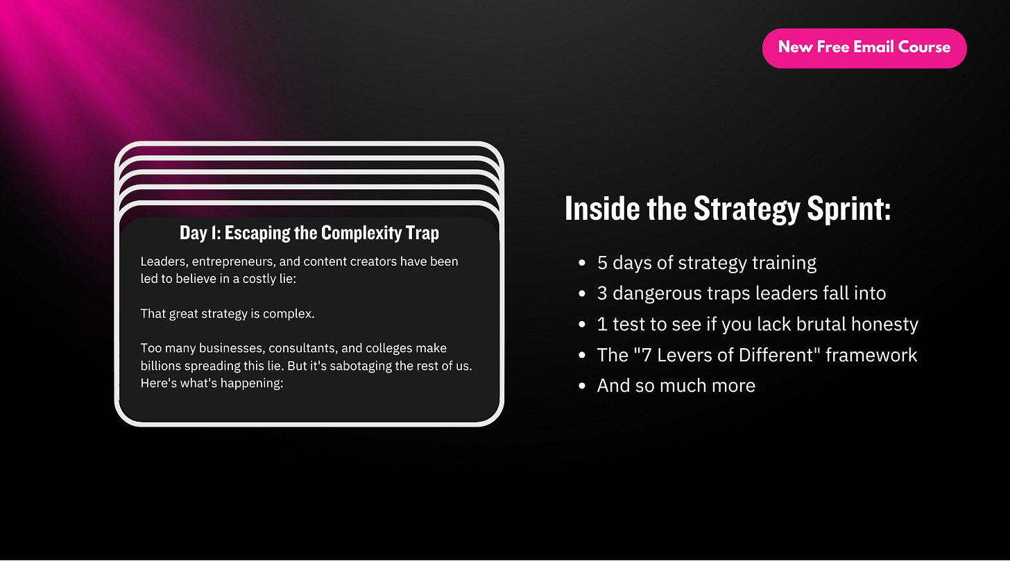Start creating a radically simple, differentiated strategy in 5 days with the free Strategy Sprint email course. Here, you’ll learn what's holding you back from creating a new and different strategy and see what to focus on when it comes to strategy (besides your competitors). You can learn more and enroll here.