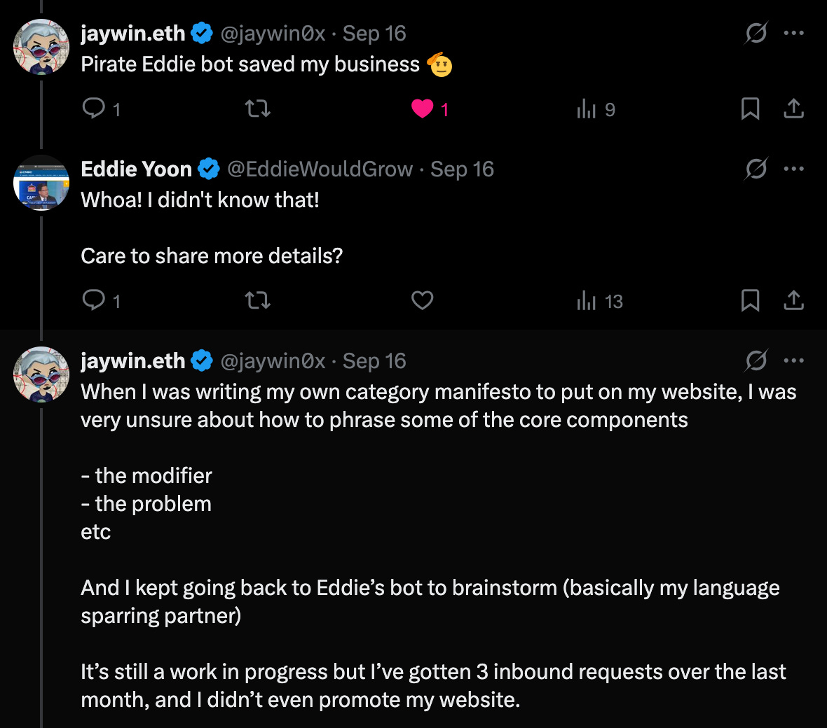 The Pirate Eddie Bot drives outcomes because it is an Agent trained to be an AI librarian with a massive context window of our extensive library of content. It has a clear role (AI librarian) with a clear use case (jamming partner in Category Design).