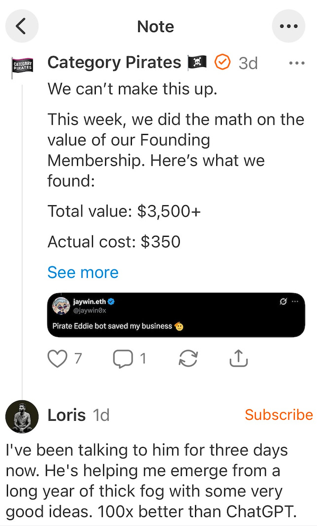 Arrrrr! đ´ââ ď¸ Welcome to a đ subscriber-only edition đ of Category Pirates. Each week, we share radically different ideas to help you design new and different categories. For more: Dive into an audiobook, listen to a category design jam session, or upgrade to a Founding subscription to ask the Pirate Eddie Bot your category design questions.