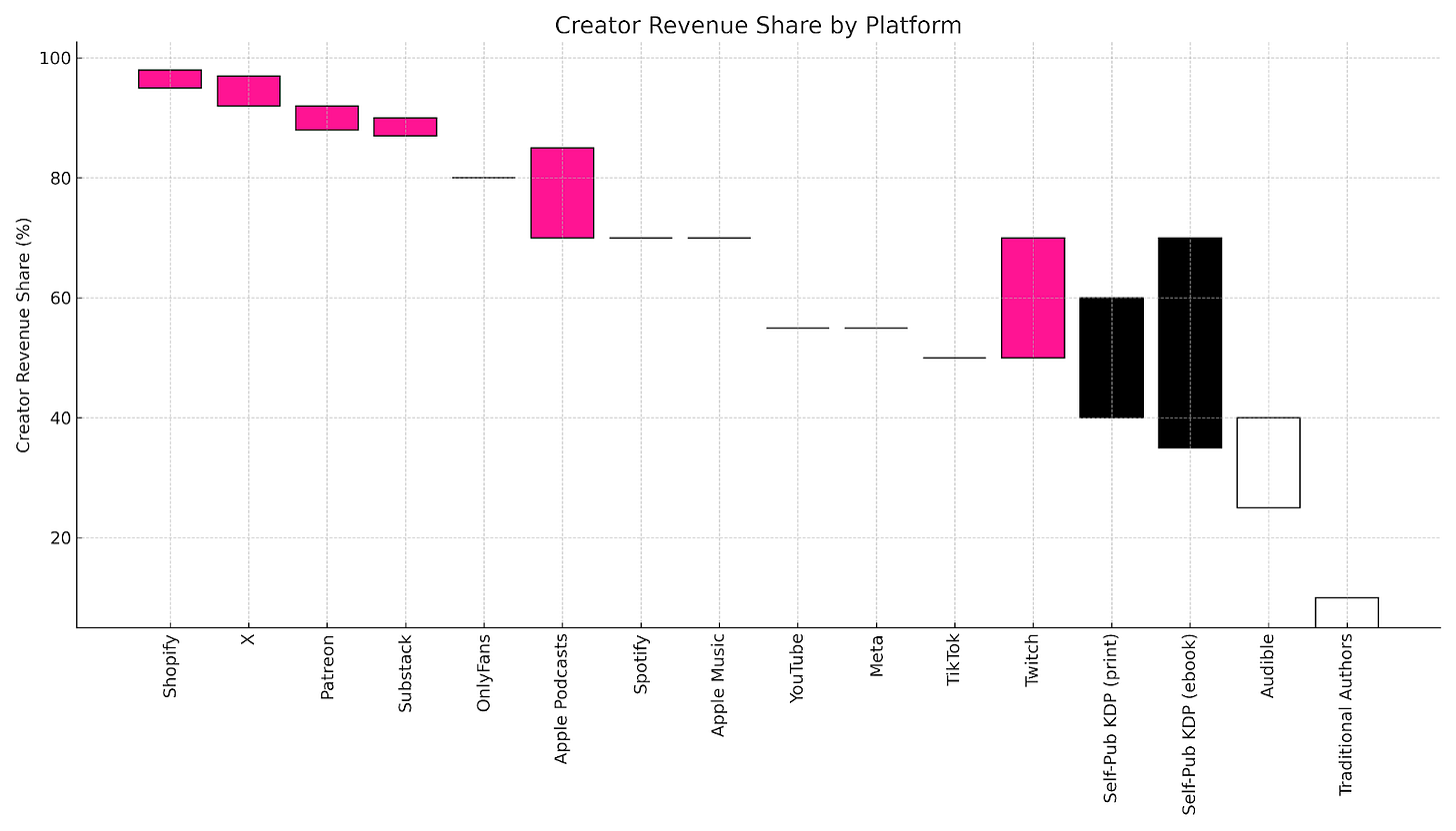 Shopify, X, Patreon, Substack, and OnlyFans share 80% or more of revenue with creators.